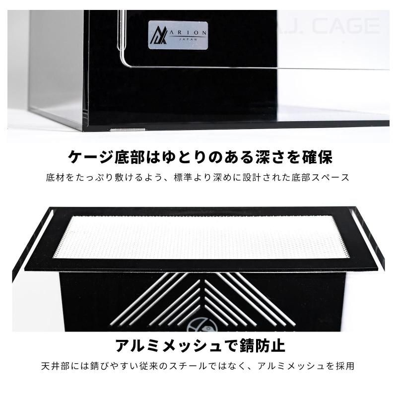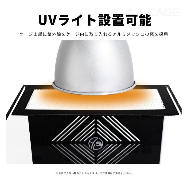 ケージ上部には、紫外線をしっかり透過するアルミメッシュを採用。 外部からの紫外線ライトの照射がケージ内に届くため、従来のアクリルケージでは難しかった紫外線を必要とする樹上性爬虫類の飼育を可能にしました。 また、アクリル製で軽量なため、ガラスケージに比べて設置場所を選ばず、持ち運びやレイアウト変更もスムーズに行えます。