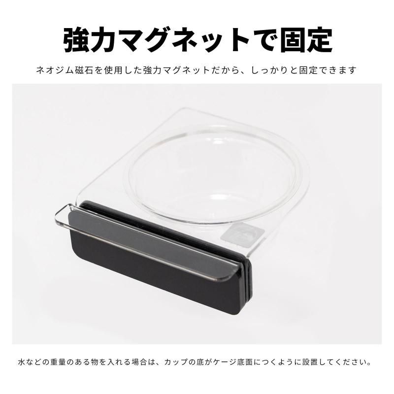 ケージの壁面なら好きな場所に取り付け可能。遊び場やレイアウトの一部として活用でき、新しい飼育アイテムとして役立ちます。テストでは、生体がデリカップの中で休んだり遊ぶ姿も多く確認されました。汚れてしまった場合も、デリカップを外して洗浄したり、マグネットでホルダーごと簡単に取り外して清掃できるのでお手入れもラクです。