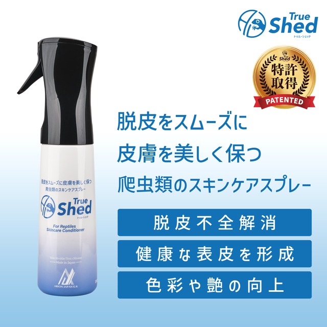 【化学的根拠に基づく脱皮促進】 ヘビ・トカゲ・ヤモリに直接スプレーするだけで、水よりも微細な分子が真皮層まで浸透し、新陳代謝を促進。脱皮不全の解消をサポートします。 化学薬品は一切使用せず、天然成分のみで作られているため、目に入っても刺激が少なく、舐めても安全。安心してお使いいただけます。 5年の歳月をかけて開発した、強力かつ安全性の高い脱皮ケア商品です。 【安心・安全】 主成分に天然由来の成分を使用し、アルコールや次亜塩素酸などの化学薬品は一切不使用。目に入っても刺激が少なく、舐めても安全なため、安心してご使用いただけます。 【生体の美しさを引き出す】 トゥルーシェッドは真皮層までしっかり浸透し、皮膚内部から新陳代謝を活性化。生体が本来持つ美しい皮膚を、内側から引き出します。さらに、新陳代謝が高まることで、餌からの栄養吸収効率も向上し、健康維持にもつながります。 【驚異のスプレー性能】 トゥルーシェッドのスプレーは、真空特殊二重構造ボトルを採用。容器内部を真空に保つことで、液体の残量に関係なく、あらゆる角度から安定した噴射が可能です。さらに、従来の手動式ノンガスタイプでは難しかった超微粒子ミスト+連続噴射を実現しました。 【ご注意】 途中で開栓するとボトル内の真空状態が損なわれ、正常な噴射ができなくなります。 【トゥルーシェッドをはじめてご使用になる方へ】 ・導入初期は、生体の真皮層にある新陳代謝を素早く促すため、 1~2日おきに全体がしっかり濡れる程度にスプレーしてください。 ・脱皮前で皮膚が白く濁ってきた場合は、通常より多めに散布するのが 効果的です。 ・散布後、脱皮がスムーズに行われ、脱皮不全が改善された場合は、 3~4日おきに軽くミストがかかる程度の散布に切り替えてください。 ・改善が見られない場合は、新陳代謝が十分に活性化されていない 可能性があるため、引き続き1~2日おきの散布を継続してください。 ・新陳代謝の反応には個体差があります。散布の頻度や量は、 生体の様子を観察しながら調整してください。 ・代謝が活性化すると、脱皮不全の解消にとどまらず、色彩の向上や 栄養吸収率の改善など、より健康的な成長にもつながります。 【製品情報】 配合成分: クエン酸ナトリウム、カルボン酸系有機物、乳酸等、麦芽糖、L-酒石酸、フェチン酸、L-アスコルビン酸ナトリウム 内容量:300ml 製品カテゴリ:脱皮促進剤・スキンケア 製造国:日本 配送サイズ:サイズ小