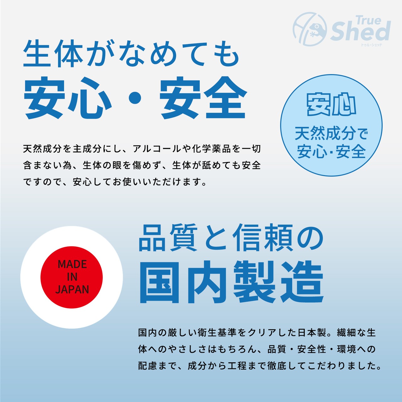 主成分に天然由来の成分を使用し、アルコールや次亜塩素酸などの化学薬品は一切不使用。目に入っても刺激が少なく、舐めても安全なため、安心してご使用いただけます。