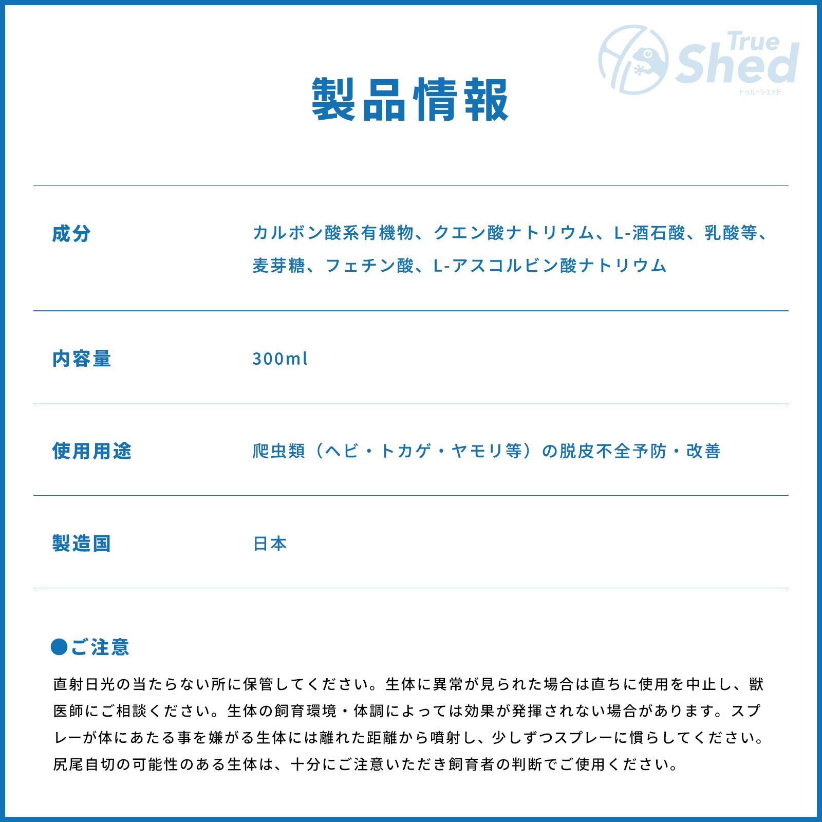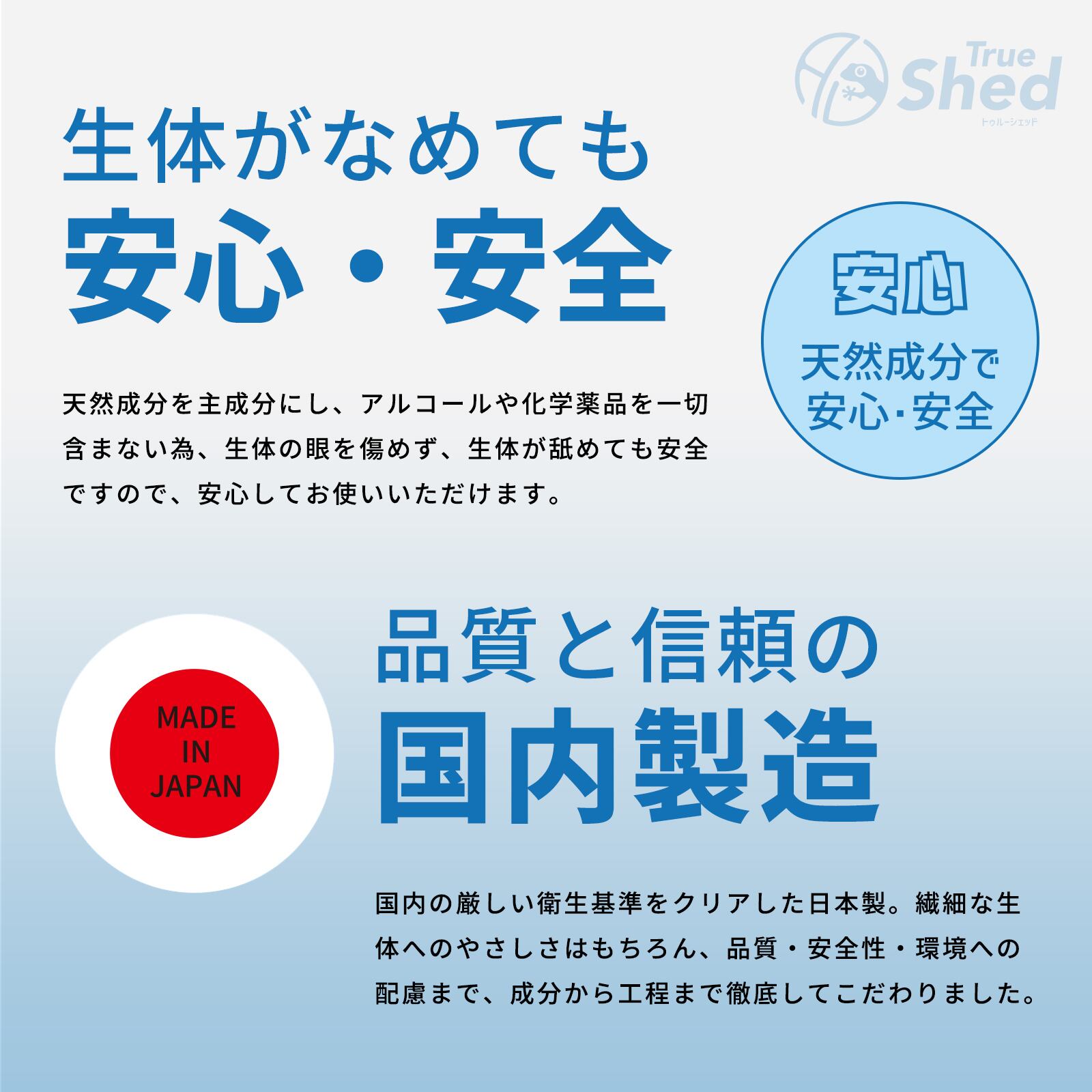 ヘビ・トカゲ・ヤモリに直接スプレーするだけで、水よりも微細な分子が真皮層まで浸透し、新陳代謝を促進。脱皮不全の解消をサポートします。