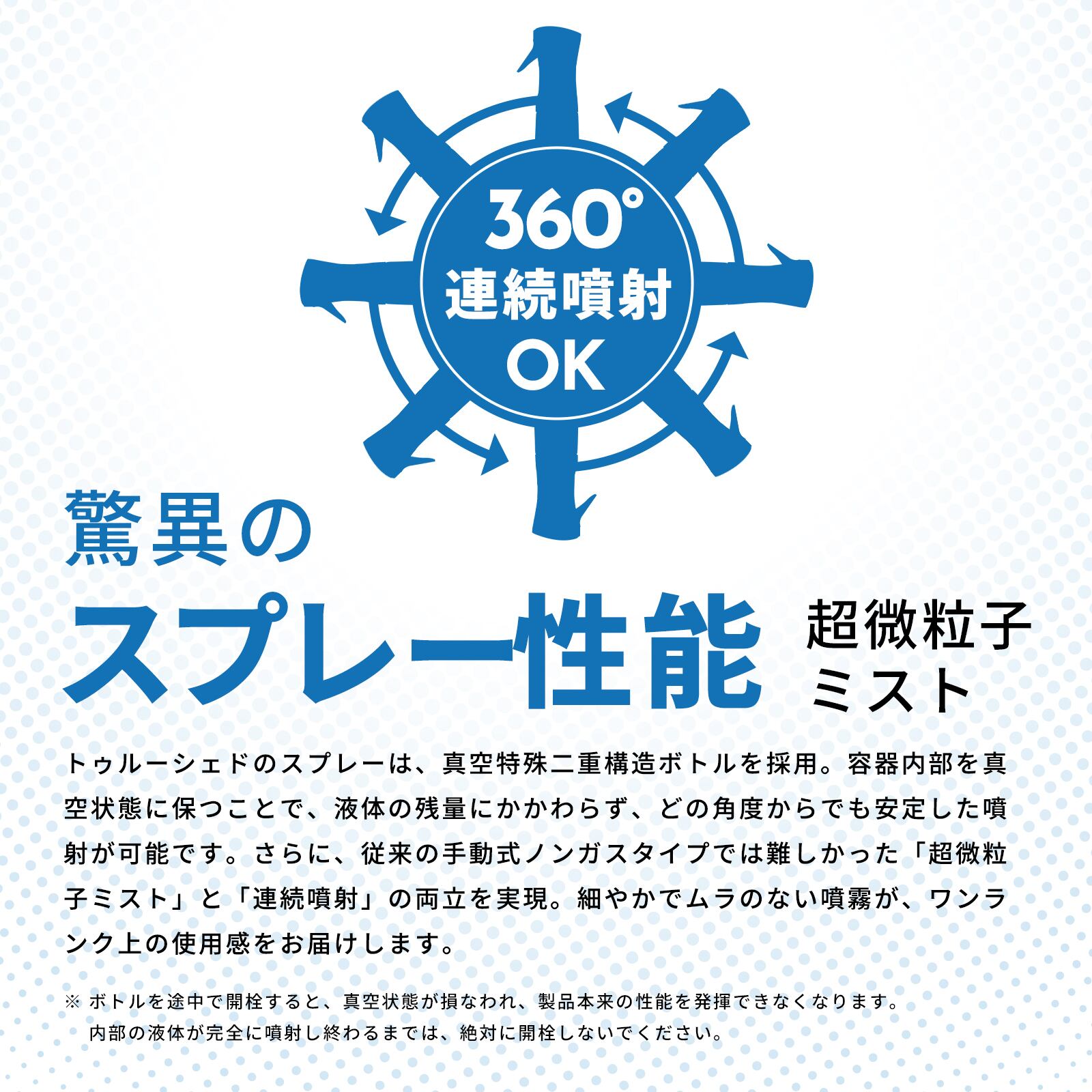 トゥルーシェッドのスプレーは、真空特殊二重構造ボトルを採用。容器内部を真空に保つことで、液体の残量に関係なく、あらゆる角度から安定した噴射が可能です。さらに、従来の手動式ノンガスタイプでは難しかった超微粒子ミスト+連続噴射を実現しました。