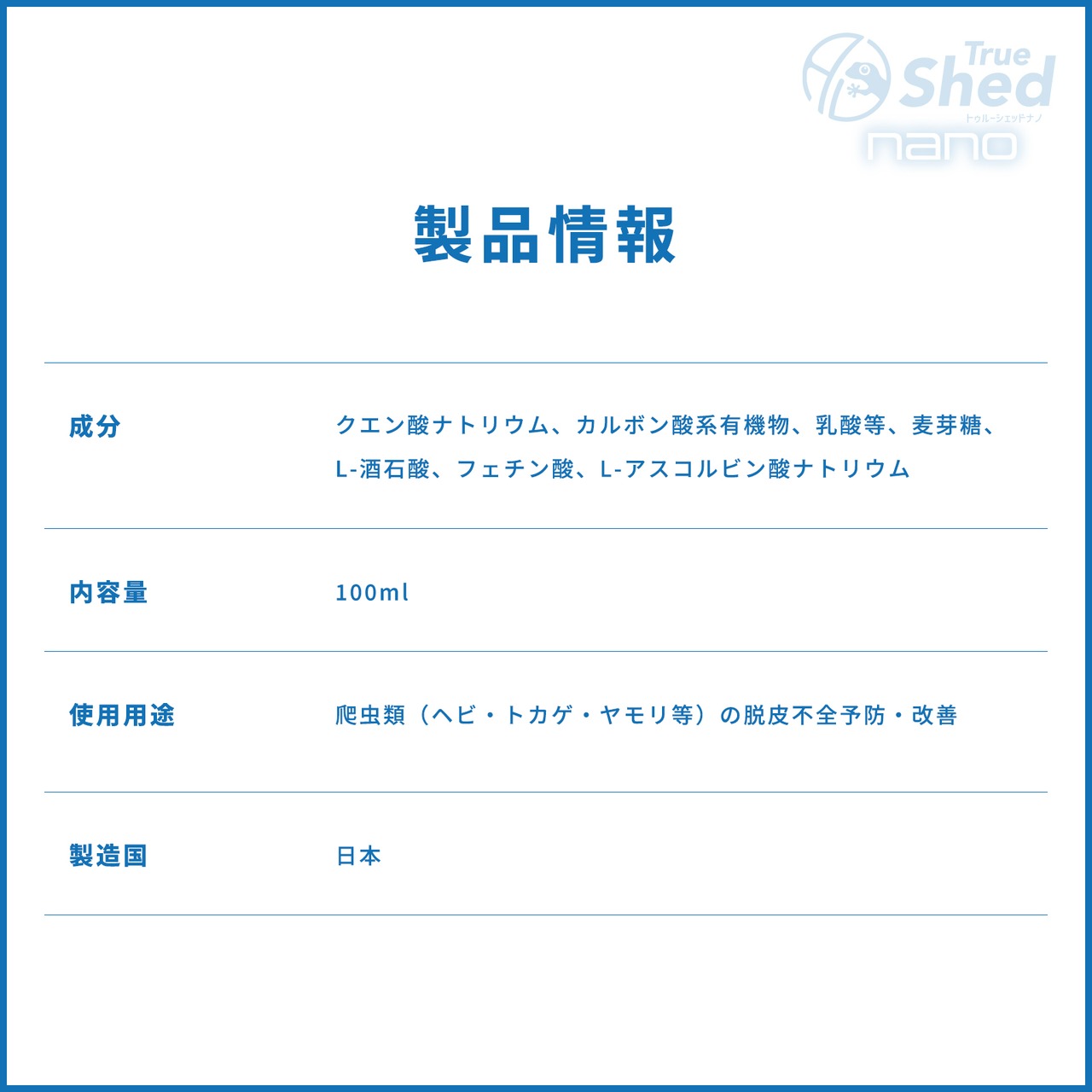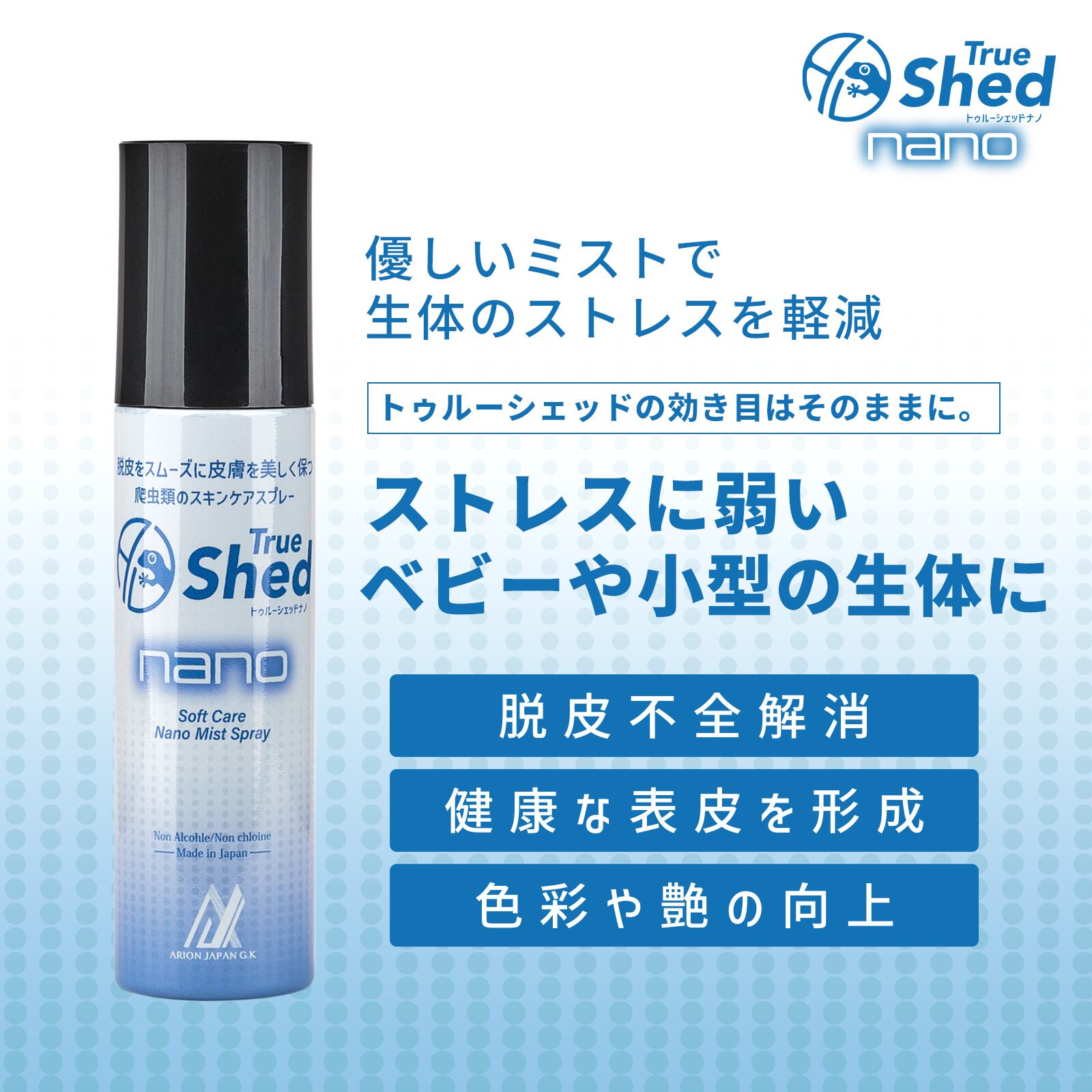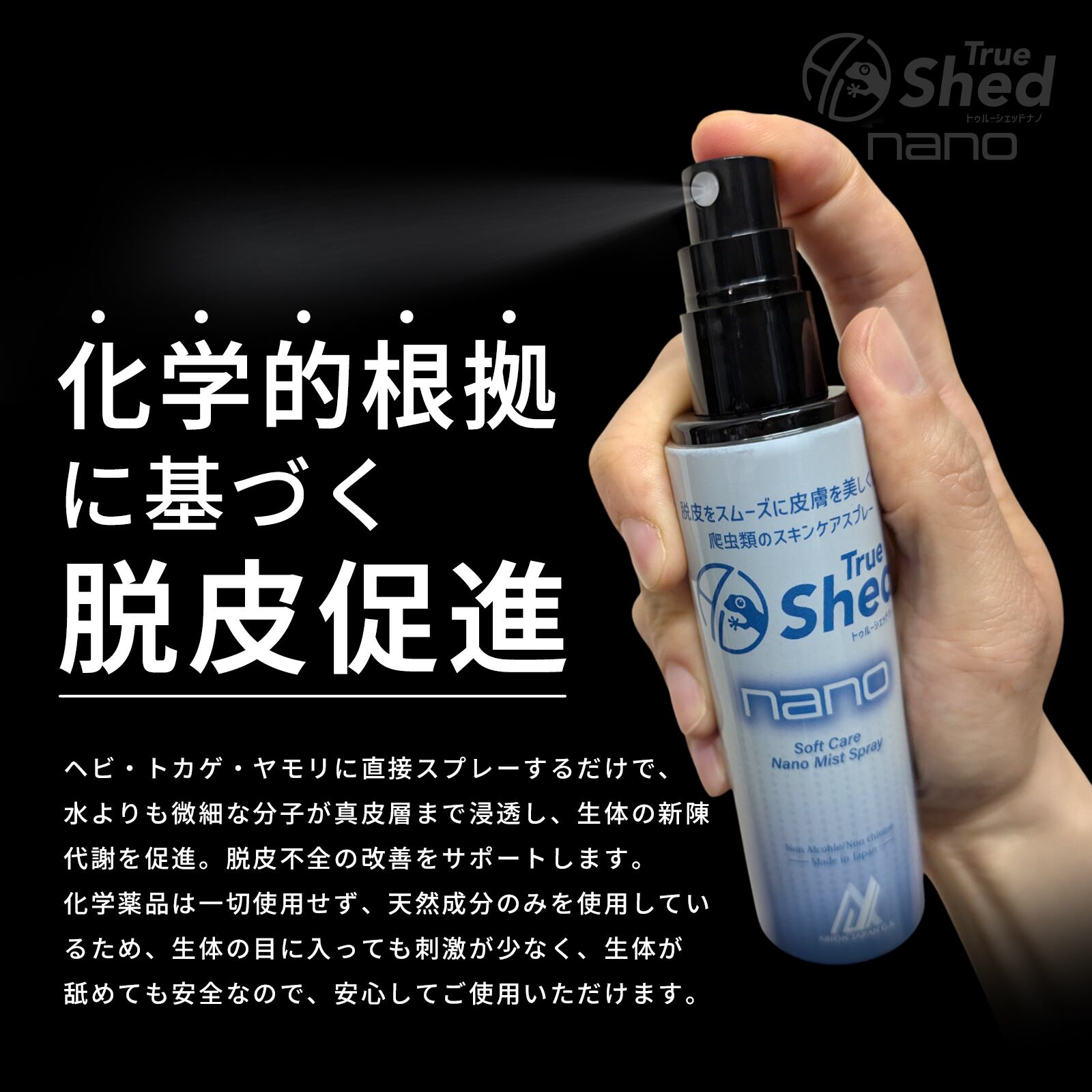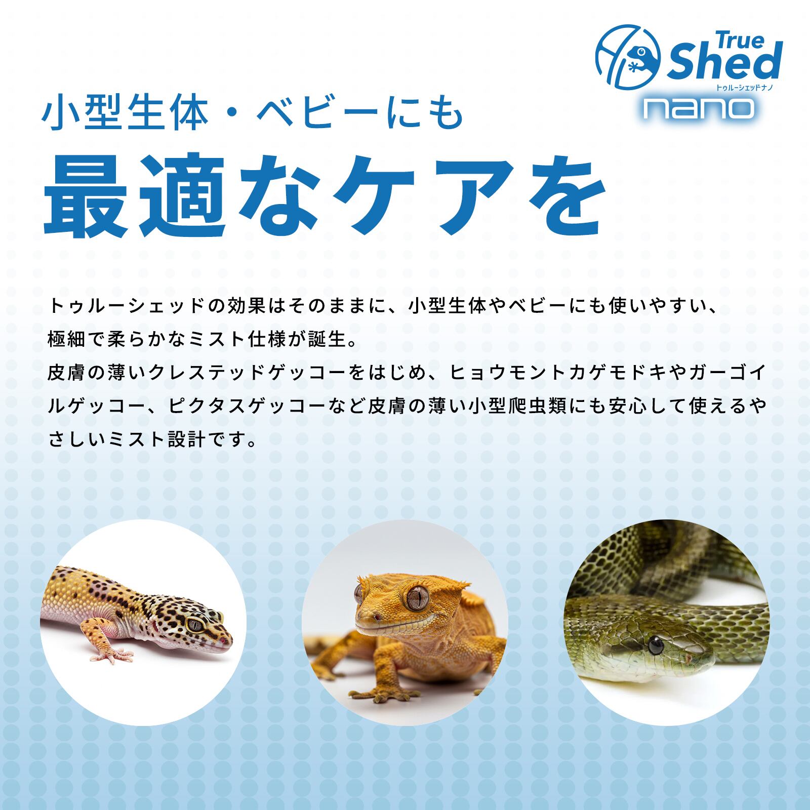 クレステッドゲッコーをはじめ小型生体・ベビーなど皮膚組織が薄い生体には、微細ミストが包み込む事で浸透し易くトゥルーシェッドの効果が更に発揮されます。また小型ボトル&微細ミストは様々な生体のポイントケアにも使い易い仕様になっておりケージ内での取り回しも容易に行えます。