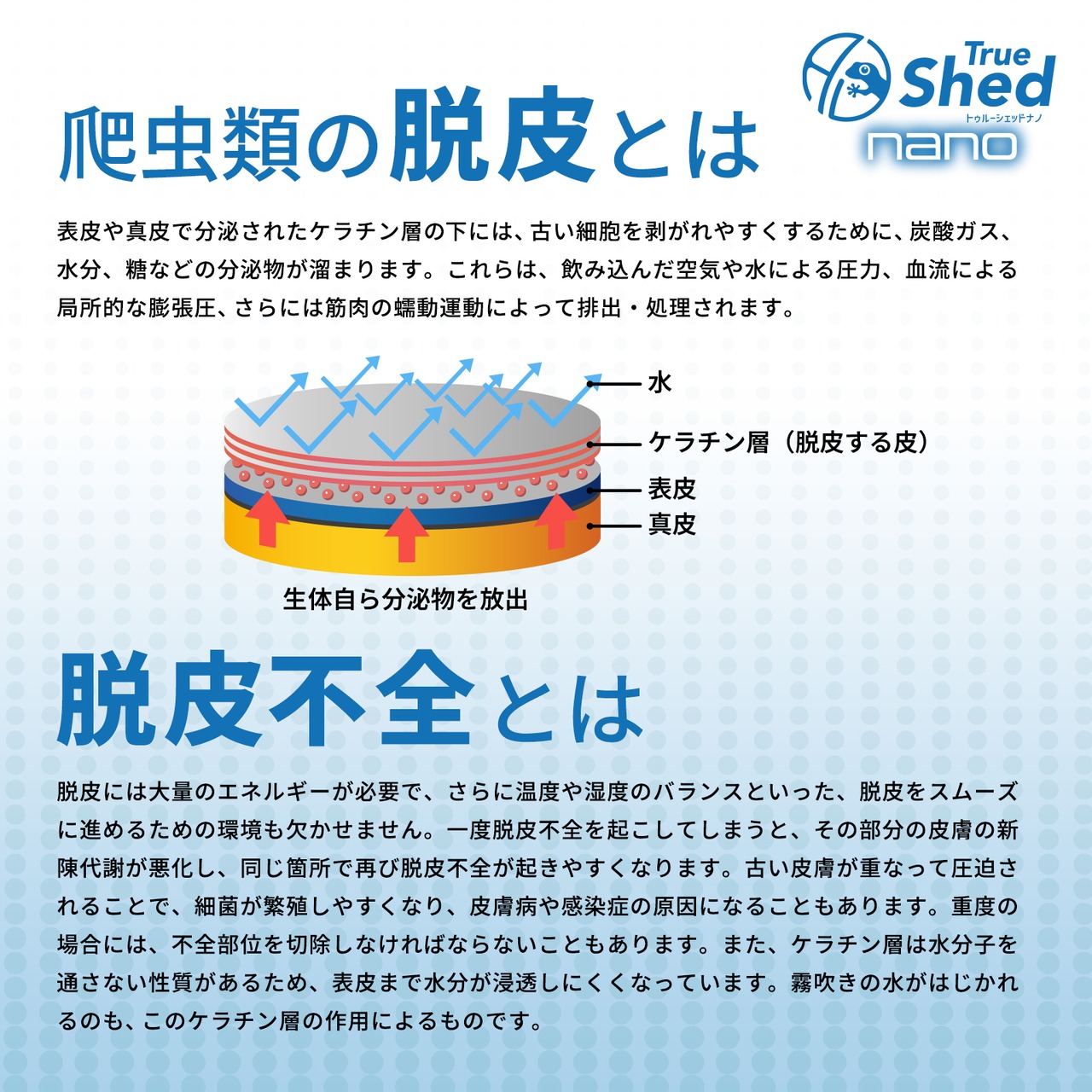 ヘビ・トカゲ・ヤモリに直接スプレーするだけで、水よりも微細な分子が真皮層まで浸透し、新陳代謝を促進。脱皮不全の解消をサポートします。