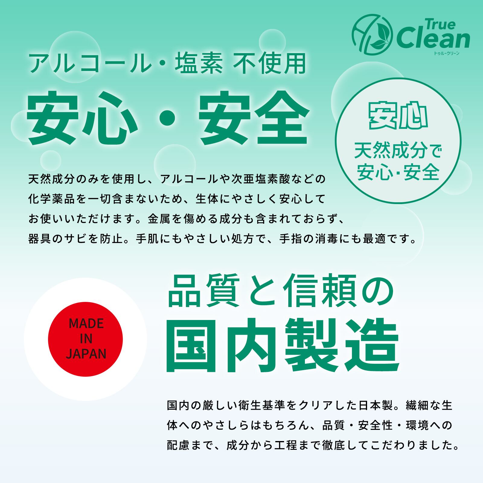 トゥルークリーンのスプレーは、真空特殊二重構造ボトルを採用。容器内部を真空に保つことで、液体の残量に関係なく、あらゆる角度から安定した噴射が可能です。さらに、従来の手動式ノンガスタイプでは難しかった超微粒子ミスト+連続噴射を実現しました。