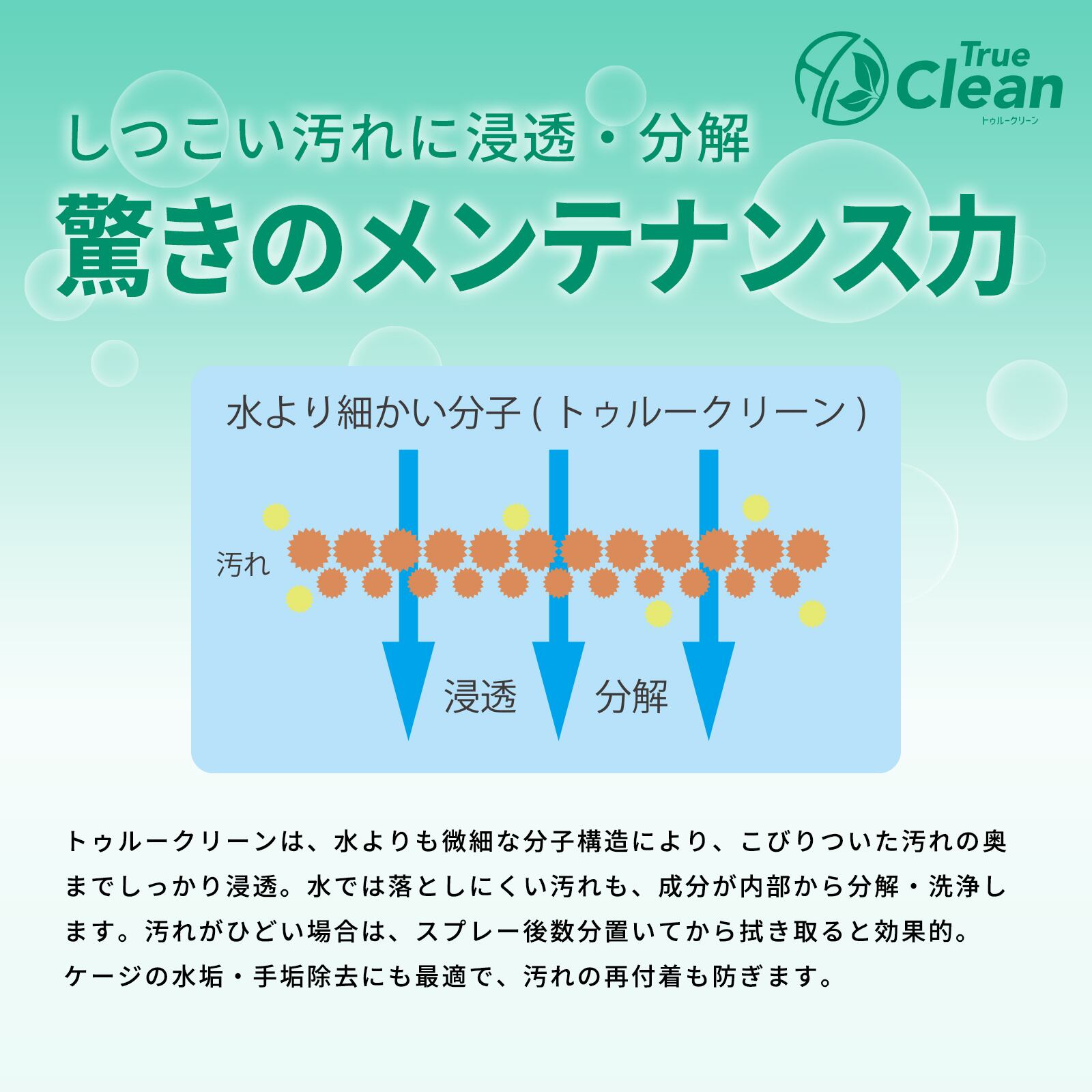 トゥルークリーンは、水よりも微細な分子構造により、こびりついた汚れの奥までしっかり浸透。水では落としにくい汚れも、成分が内部から分解・洗浄します。汚れがひどい場合は、スプレー後数分置いてから拭き取ると効果的。 ケージの水垢・手垢除去にも最適で、汚れの再付着も防ぎます。