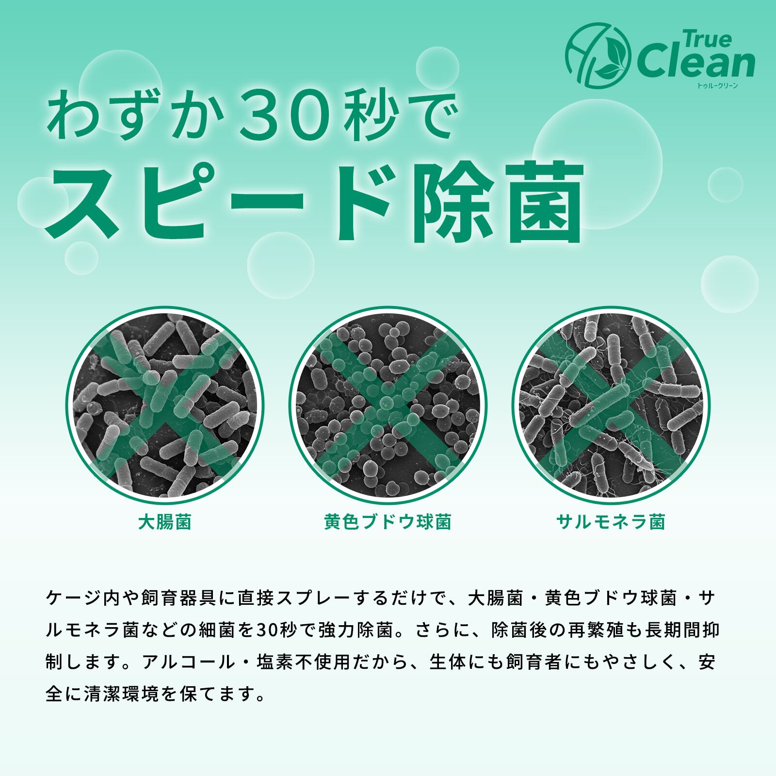 ケージ内や飼育器具に直接スプレーするだけで、大腸菌・黄色ブドウ球菌・サルモネラ菌などの細菌を30秒で強力除菌。さらに、除菌後の再繁殖も長期間抑制します。アルコール・塩素不使用だから、生体にも飼育者にもやさしく、安全に清潔環境を保てます。