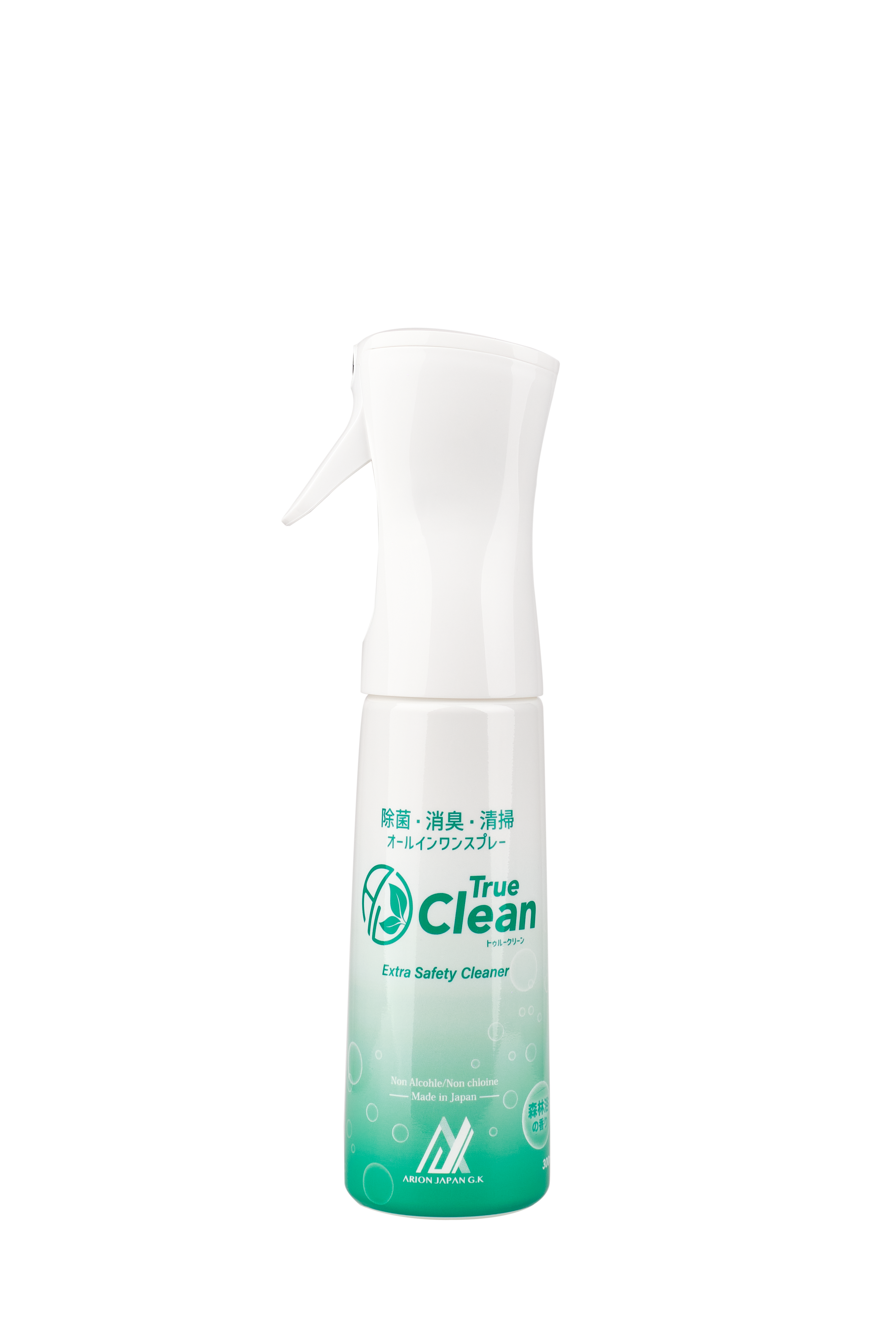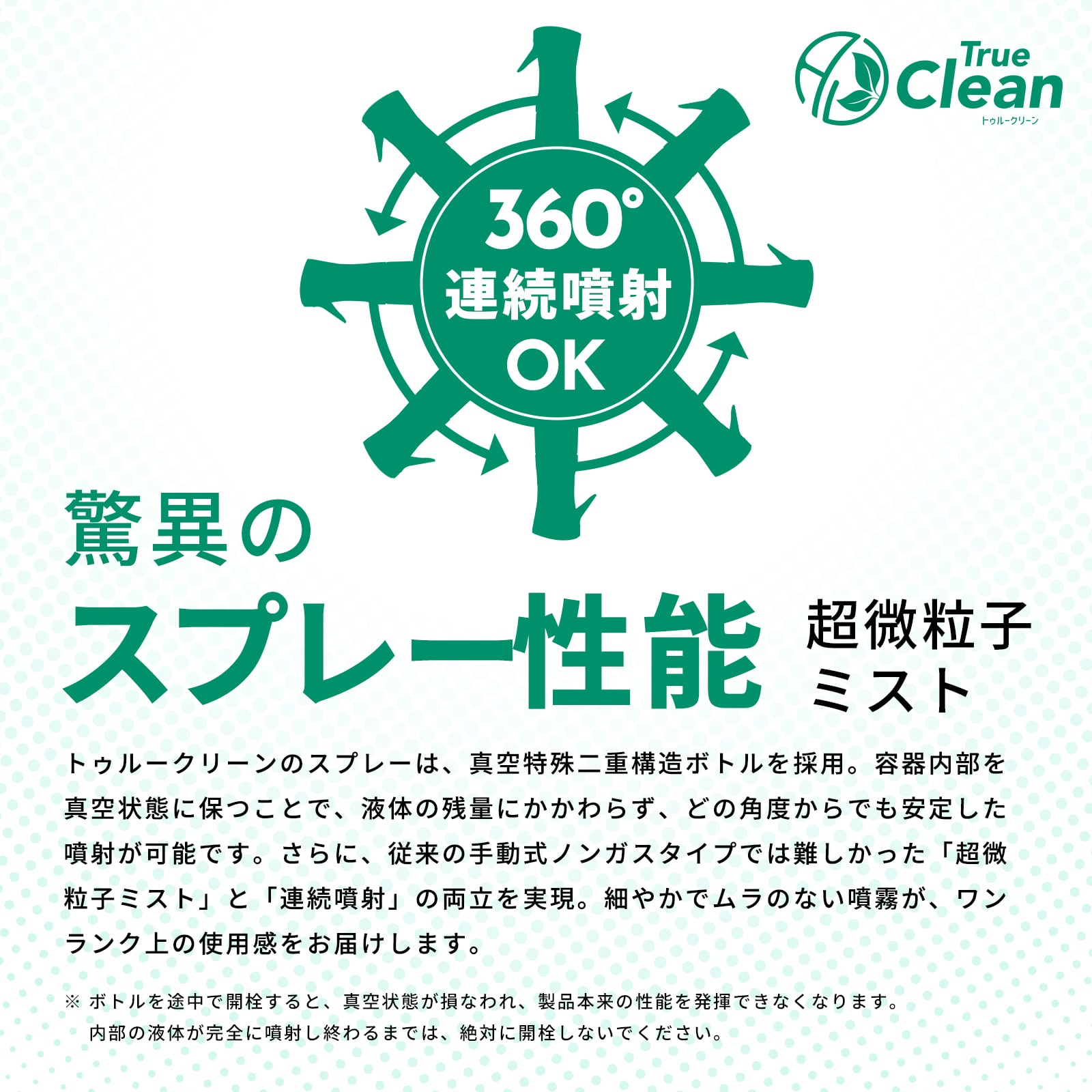 トゥルークリーンのスプレーは、真空特殊二重構造ボトルを採用。容器内部を真空に保つことで、液体の残量に関係なく、あらゆる角度から安定した噴射が可能です。さらに、従来の手動式ノンガスタイプでは難しかった超微粒子ミスト+連続噴射を実現しました。