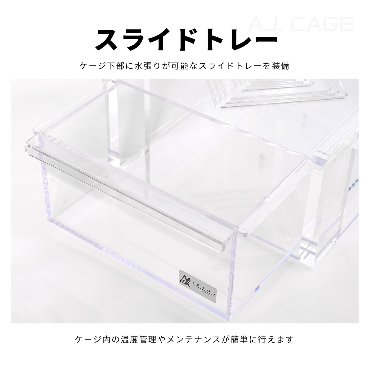 C1シリーズは「美しく生体をコレクションする」「メンテナンス性を高める」ことをコンセプトに開発された、新発想のスライド式アクリルケージ。ケージごと手前に引き出すだけで、給餌・水換え・掃除などの作業がスムーズに行えます。