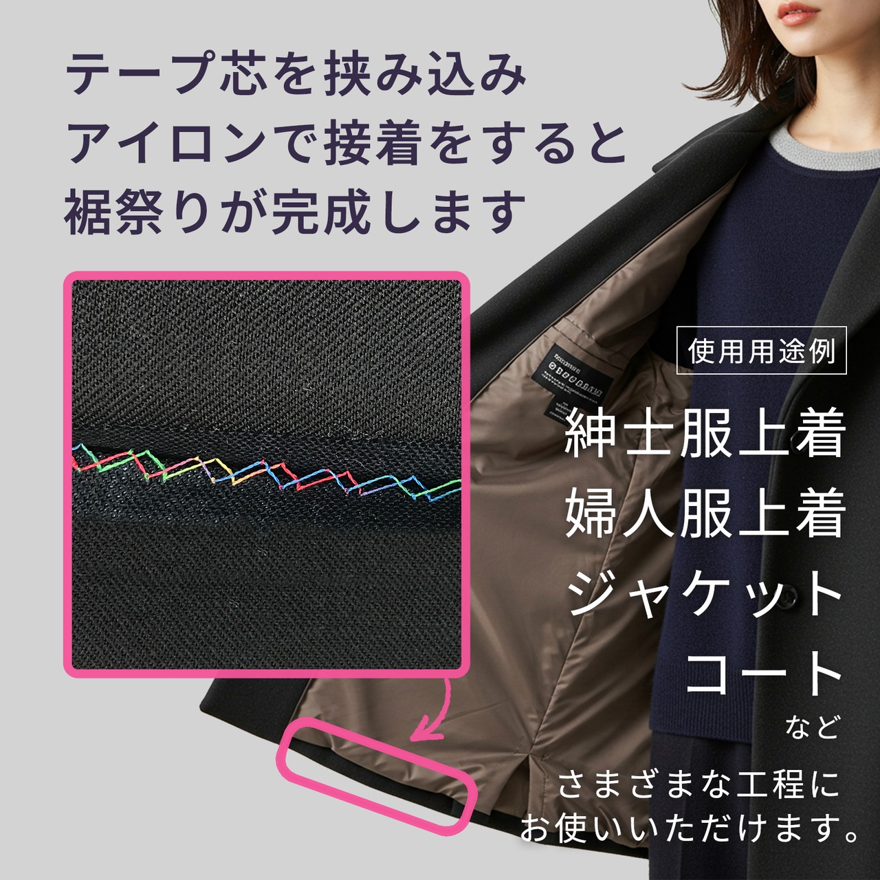 テープ芯を挟み込み、アイロンで接着することで、あっという間に裾まつりが完成。商品のグレードアップに貢献いたします。